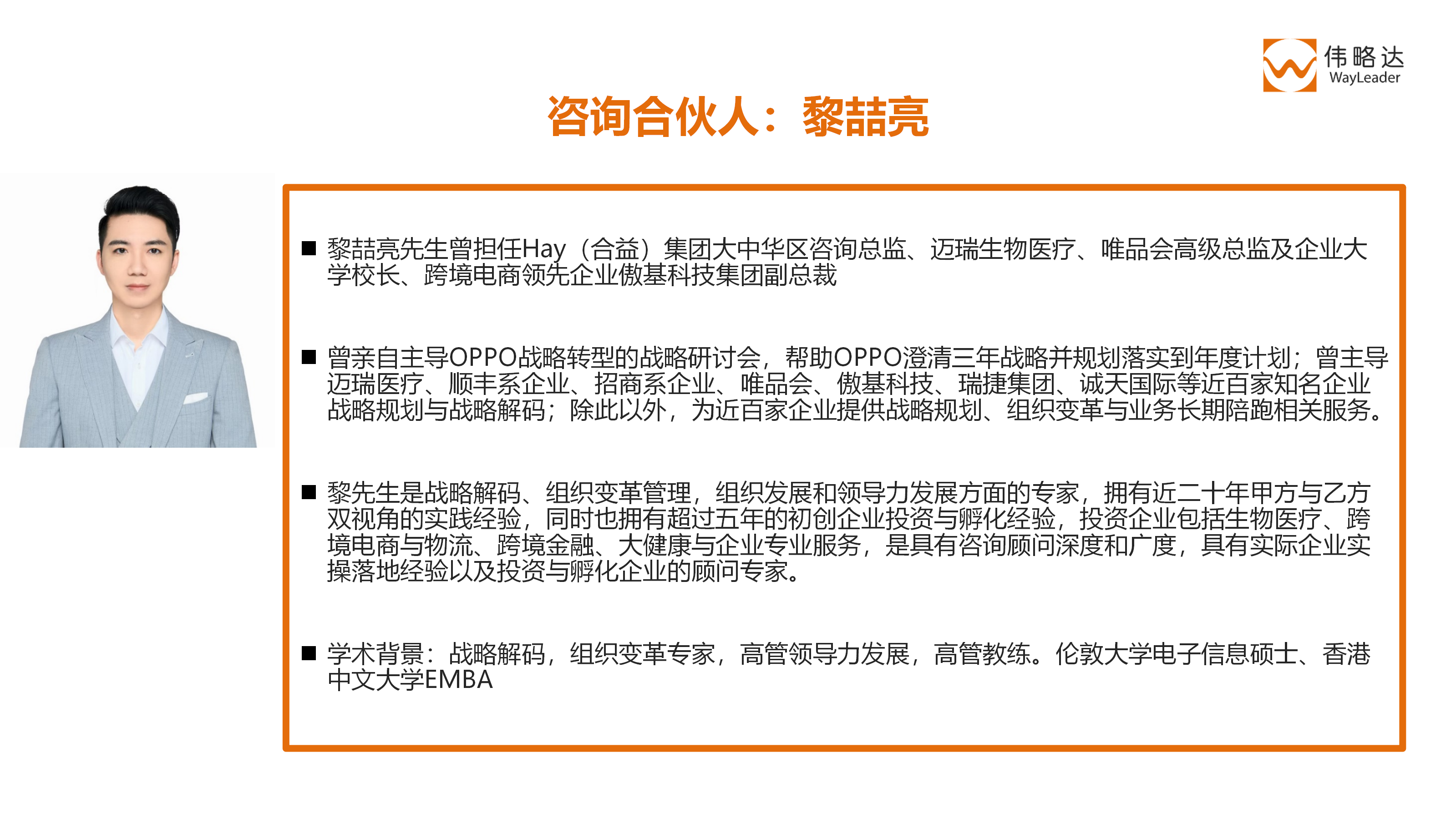 兼具国际咨询公司专业经验和知名企业高管经验,是我们合伙人团队的特征。为的是保证我们给客户提供可执行、可衡量效果的解决方案。